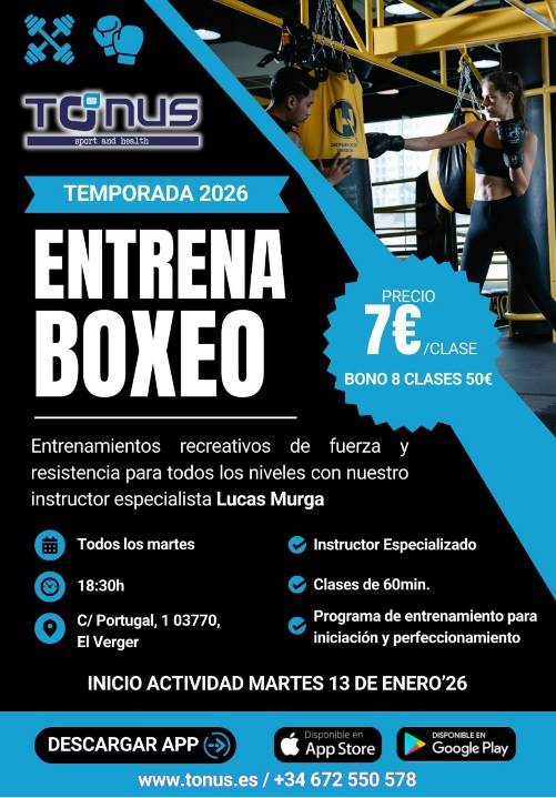 CLASES DE BOXEO A PARTIR DE ENERO Actividades y Servicios 23/12/2025 Hola En enero tendremos CLASES de BOXEO Para más info: +34 672 55 05 78 info@tonus.es Un saludo Tonus "Sport & Health"