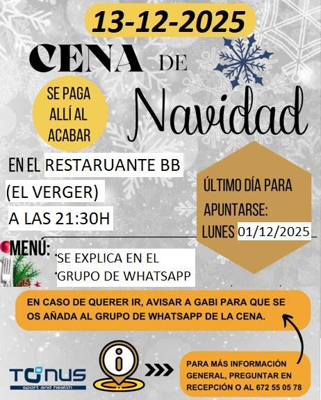 El proximo SABADO 13 DE DICIEMBRE tendra lugar la cena de NAVIDAD de TONUS "SPORT & HEALTH" en el restarurante BB de EL VERGER